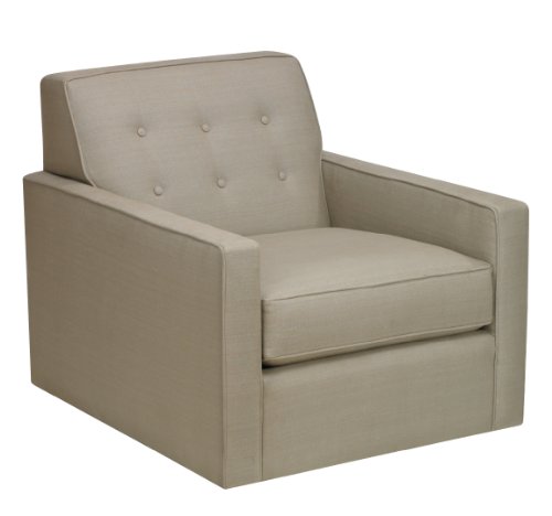 Recycled metal drift mechanism both drifts and swivels Designed with midcentury modern, easy, straight lines, lined button tufting, monitor arms and welt detail Coordinates with DwellStudio's Standard Ottoman Handmade single-wrapped foam cushions with linen upholstery Custom made in the USA of sustainable hardwood that's licensed by using the Sustainable Forestry Initiative (SFI)